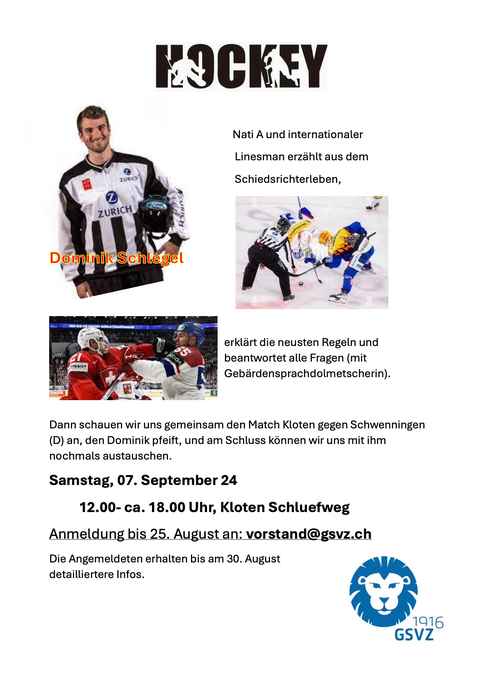 Anmeldung bis 25. August an: vorstand@gsvz.ch